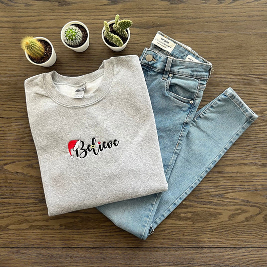 Believe Sweatshirt, Besticktes Shirt, Frohe Weihnachten Shirt, Weihnachtsshirt, Weihnachtsmütze, Weihnachtsbaum, Familien Weihnachtsshirts