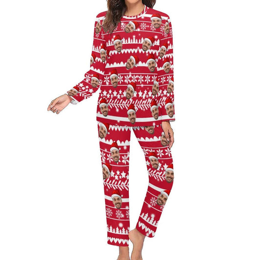 Aangepaste vriendje gezicht kerstpatroon nachtkleding gepersonaliseerde dames pyjama party ronde hals lange pyjama set