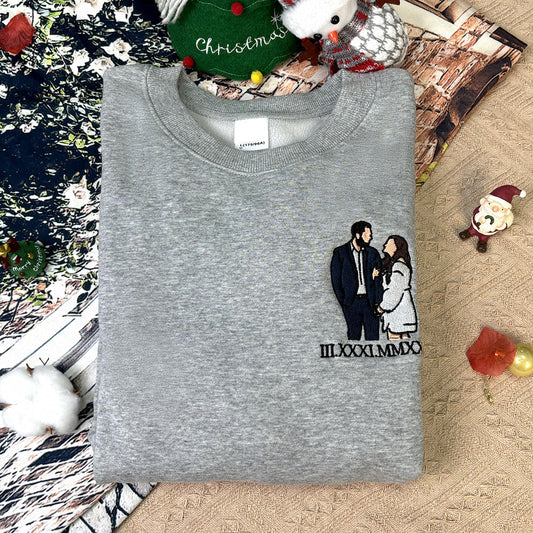 Plus Fluwelen Stijl - Op Maat Geborduurd Sweatshirt, Portret, Muziekspeler/Romeinse Cijfers/Aangepaste Tekst, Cadeau Voor Koppels En Familie