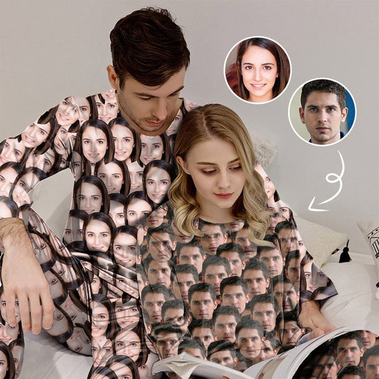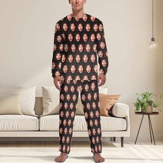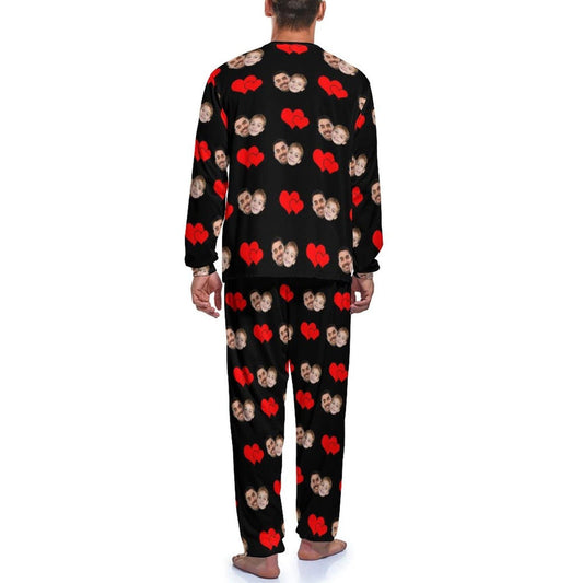 Gepersonaliseerde fotopyjama voor mannen, aangepaste gezichtminnaar hoofd ronde hals lange pyjamaset, cadeaus voor koppels