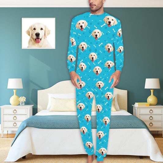 Gepersonaliseerde hondenpyjama, gepersonaliseerd huisdiergezicht, poot en botten, herenpyjamaset met all-over print