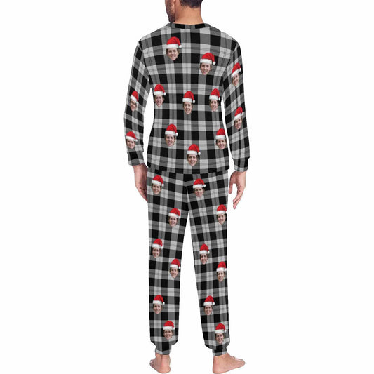 Gepersonaliseerde kerstpyjama met aangepast gezicht, zwarte en grijze strepen, herenpyjamaset met all-over print