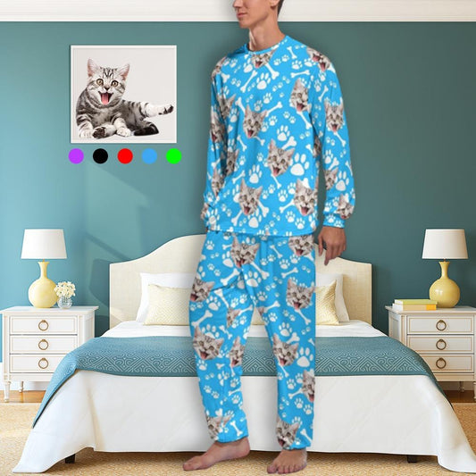 Gepersonaliseerde lange ronde hals huisdier pyjama set aangepaste gezicht kat voetafdrukken herenpyjama