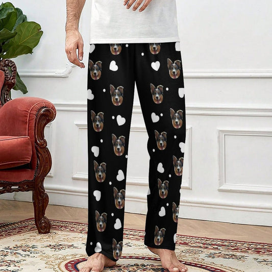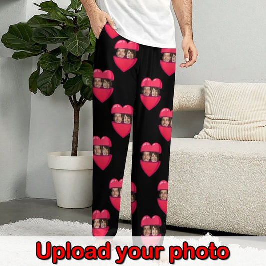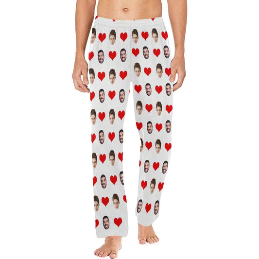 Lange pyjamabroek met aangepast gezicht en rood liefdeshart, gepersonaliseerde pyjamafeest-nachtkleding voor heren