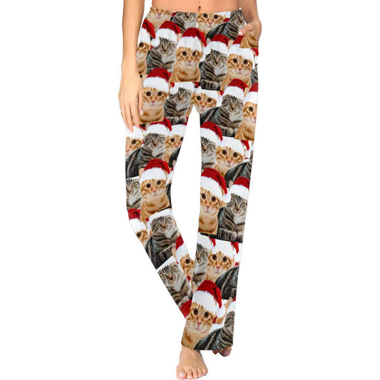 Aangepaste gezicht huisdier kat Kerstmis rode hoed nachtkleding gepersonaliseerde dames- en herenpyjamafeest lange pyjamabroek