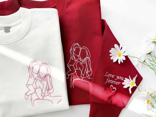 Geborduurd familieportret op hoodie, geborduurde trui voor Moederdag, truien met portretten van vader en moeder, cadeau voor vader en moeder